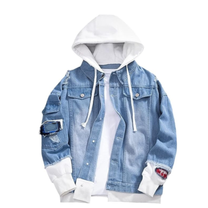 Men’s Hooded Denim Jacket Streetwear – Distressed Blue Jean Jacket with Removable Hood, Relaxed Fit Hip-Hop Trucker Coat